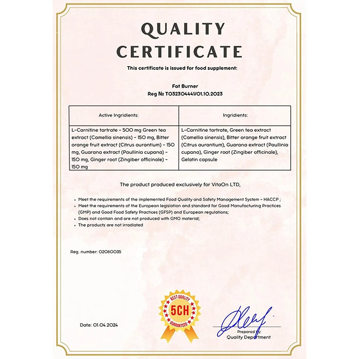 Das Vertrauen unserer Kunden ist unsere oberste Priorität. Aus diesem Grund wird jedes Produkt von VitaOn gemäß dem Standard für Gute Herstellungspraxis (GMP) hergestellt, dem Goldstandard der Branche. Dies garantiert eine strenge Kontrolle in jedem Schritt – von der Auswahl der Rohstoffe bis zur Verkapselung und Verpackung. Als zusätzliche Garantie für Authentizität und Sicherheit ist unser Fat Burner bei der Bulgarischen Agentur für Lebensmittelsicherheit (BALS) unter der Registrierungsnummer T032304441 registriert. Mit uns erhalten Sie ein Produkt, dessen Qualität, Reinheit und Wirksamkeit wir absolut sicher sind.